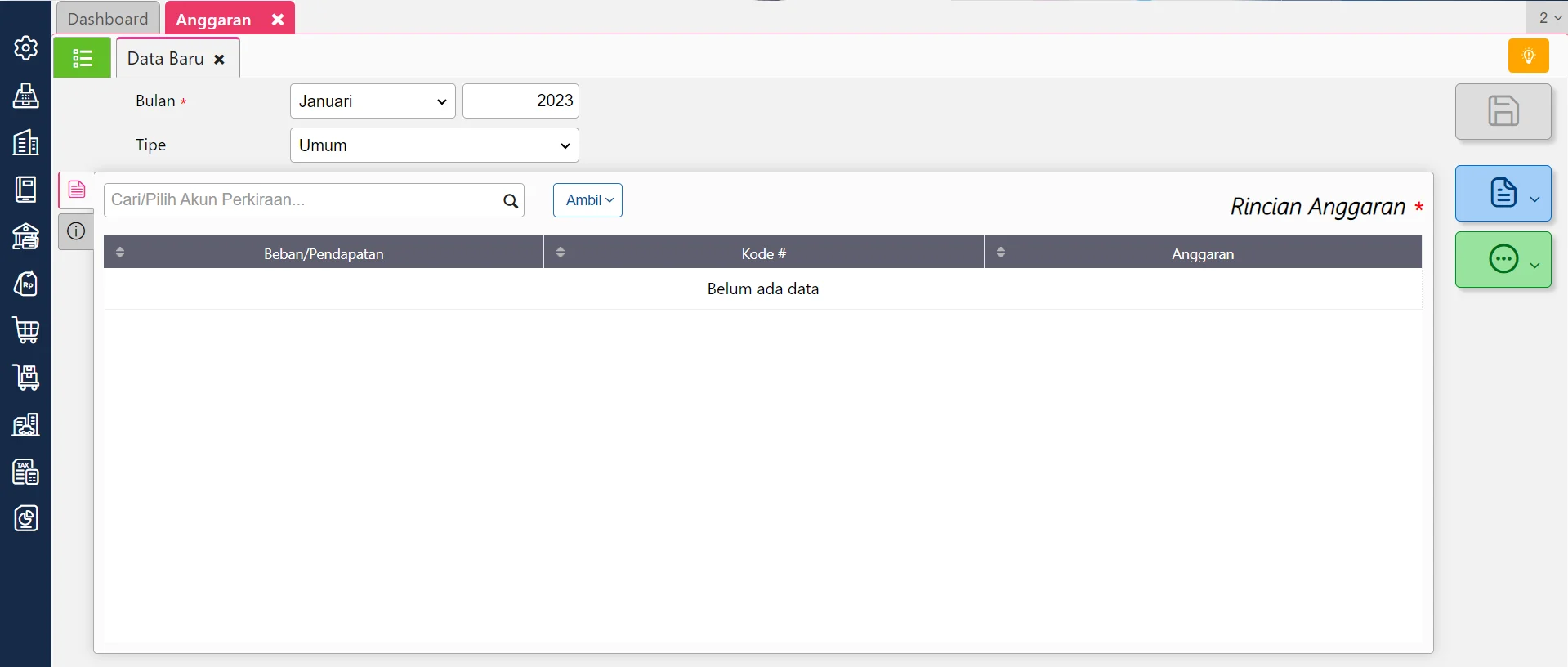 - Tipe : untuk memilih tipe anggaran yang akan di buat per periode bulan, yang terdiri dari Tipe Umum, Per Dapartemen dan Per Proyek.