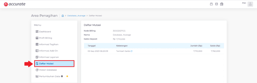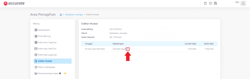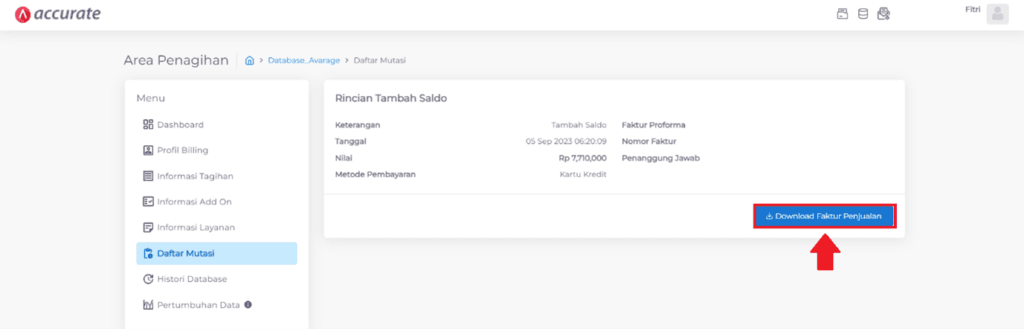 2. Pada dashboard area penagihan, pilih Nama Database yang ingin di-unduh Faktur Penjualannya, lalu klik pada informasi Daftar Mutasi.