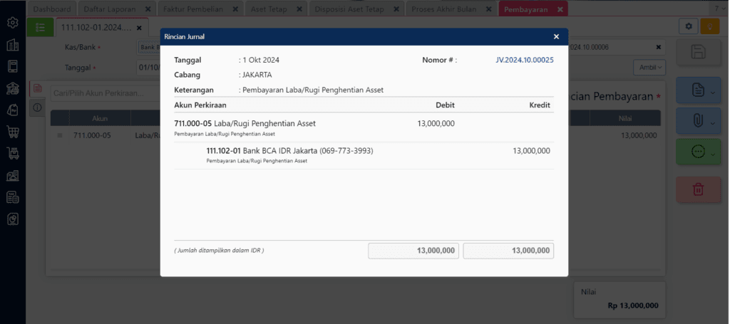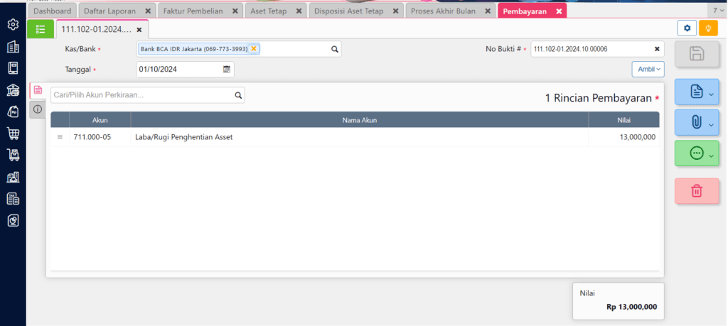 Untuk menginput pembayaran atas kekurangan dari tukar tambah aset tetap tersebut bisa dilakukan melalui Formulir Transaksi Jurnal Umum atau Pembayaran, dengan melawankan akun Kas/Bank ke akun Laba/Rugi Penghentian Aset juga.