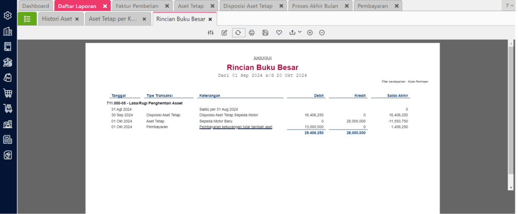 Maka jika dilihat pada Laporan Rincian Buku Besar atas akun Laba/Rugi Penghentian Aset akan didapat nilai saldo akhir akun Laba/Rugi Penghentian Aset sebesar Rp 1.406.250. Hal ini dikarenakan saat proses tukar tambah, nilai buku Aset Tetap Lama adalah sebesar Rp 16.406.250 namun hanya dihargai sebesar Rp 15.000.000, sehingga terdapat rugi sebesar Rp 1.406.250 atas disposisi Aset Tetap lama yang perlu diakui oleh perusahaan.