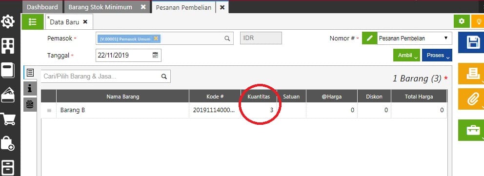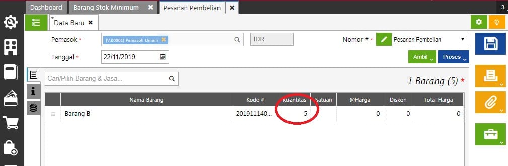 Contoh pesanan pembelian barang tidak di isi minimum beli, menampilkan kuantitas dari batas minimum stok