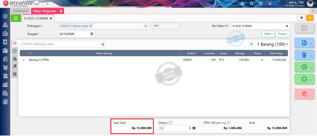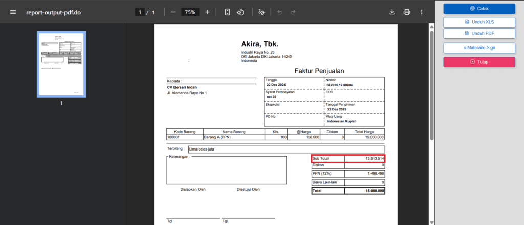 Ilustrasi: Nilai subtotal sebesar Rp 15.000.000 (termasuk PPN 12% [DPP 11/12]). Pada Cetak Faktur Penjualan ingin ditampilkan nilai subtotal (sebelum pajak) sebesar Rp 13.513.514 (15.000.000/1.11).