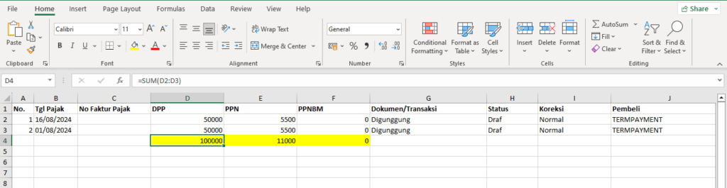 Dan untuk mengetahui nilai total DPP dari PPN Faktur Pajak Digunggung, berikut caranya :