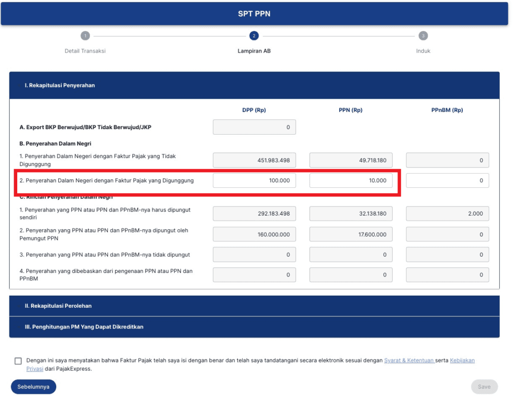 3. Selanjutnya, Anda bisa mengisikan informasi tersebut melalui aplikasi Pajak Express ataupun Pajak.io. Pada gambar adalah contoh pengisian pada Pajak Express, yaitu diisi pada lampiran AB di bagian 2. Penyerahan Dalam Negeri dengan Faktur Pajak di Digunggung.