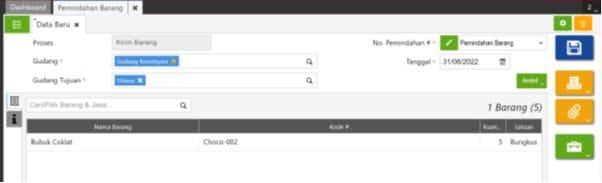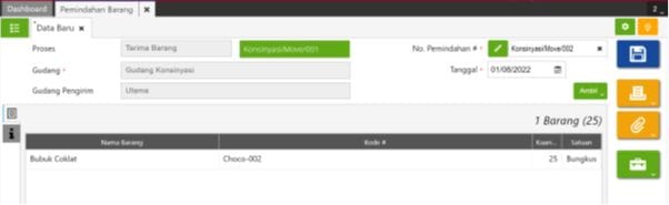 5. Dan untuk barang yang dikembalikan ke perusahaan, lakukan Pemindahan Barang kembali yaitu dengan proses Kirim dari Gudang Konsinyasi ke Gudang Utama sejumlah kuantitas yang dikembalikan dan lakukan Terima Barang atas proses Pemindahan Barang tersebut. Sehingga stok barang di Gudang Utama bertambah sebanyak 5pcs dan stok Gudang Konsinyasi berkurang sebanyak 5pcs (sesuai jumlah kuantitas barang yang dikembalikan).