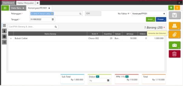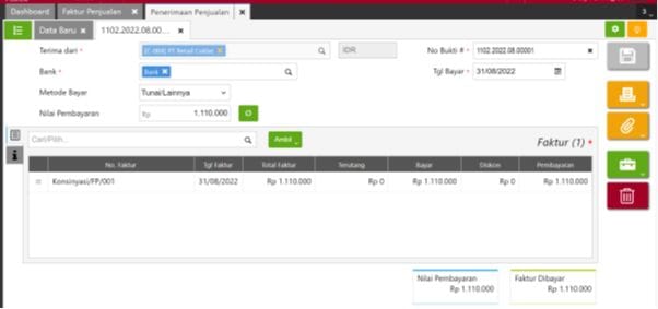 4. Pada saat terima uang barang terjual dan barang yang dikembalikan pada tanggal 31/08/2022, buat Faktur Penjualan atas barang yang berhasil terjual melalui menu Penjualan | Faktur Penjualan kemudian klik ‘Ambil’ dan pilih nomor pesanan penjualan atas titipan barang tersebut (poin 2) dan isikan sejumlah barang yang berhasil terjual yaitu 20pcs serta pilih Gudang Konsinyasi. Kemudian dilanjutkan dengan melakukan proses Penerimaan Penjualan.