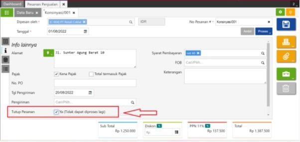 6. Dikarenakan Pesanan Penjualan sebelumnya masih berstatus “Sebagian diproses”, maka bisa dilakukan tutup manual dengan cara buka transaksi Pesanan Penjualan tersebut lalu ke tab i (info lainnya) kemudian centang informasi ‘Ya Tutup Pesanan’.