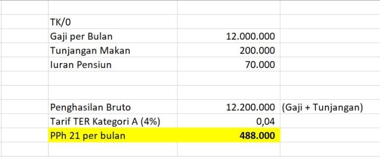 Ilustrasi : Karyawan Tetap dengan status Tidak Kawin dan tidak ada tunjangan (TK/0). Gaji pokok per bulan Rp 12.000.000, tunjangan makan Rp 200.000 per bulan dan potongan iuran pensiun yang dibayarkan oleh karyawan sebesar Rp 70.000 per bulan.