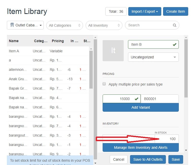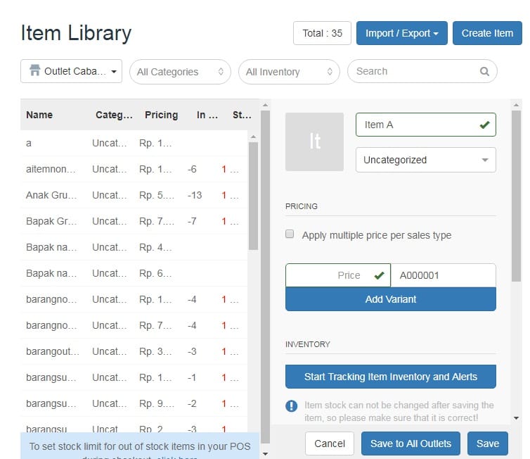 2. Buat barang baru dengan settingan yang benar di AOL, menggunakan kode barang yang sama dengan di Moka